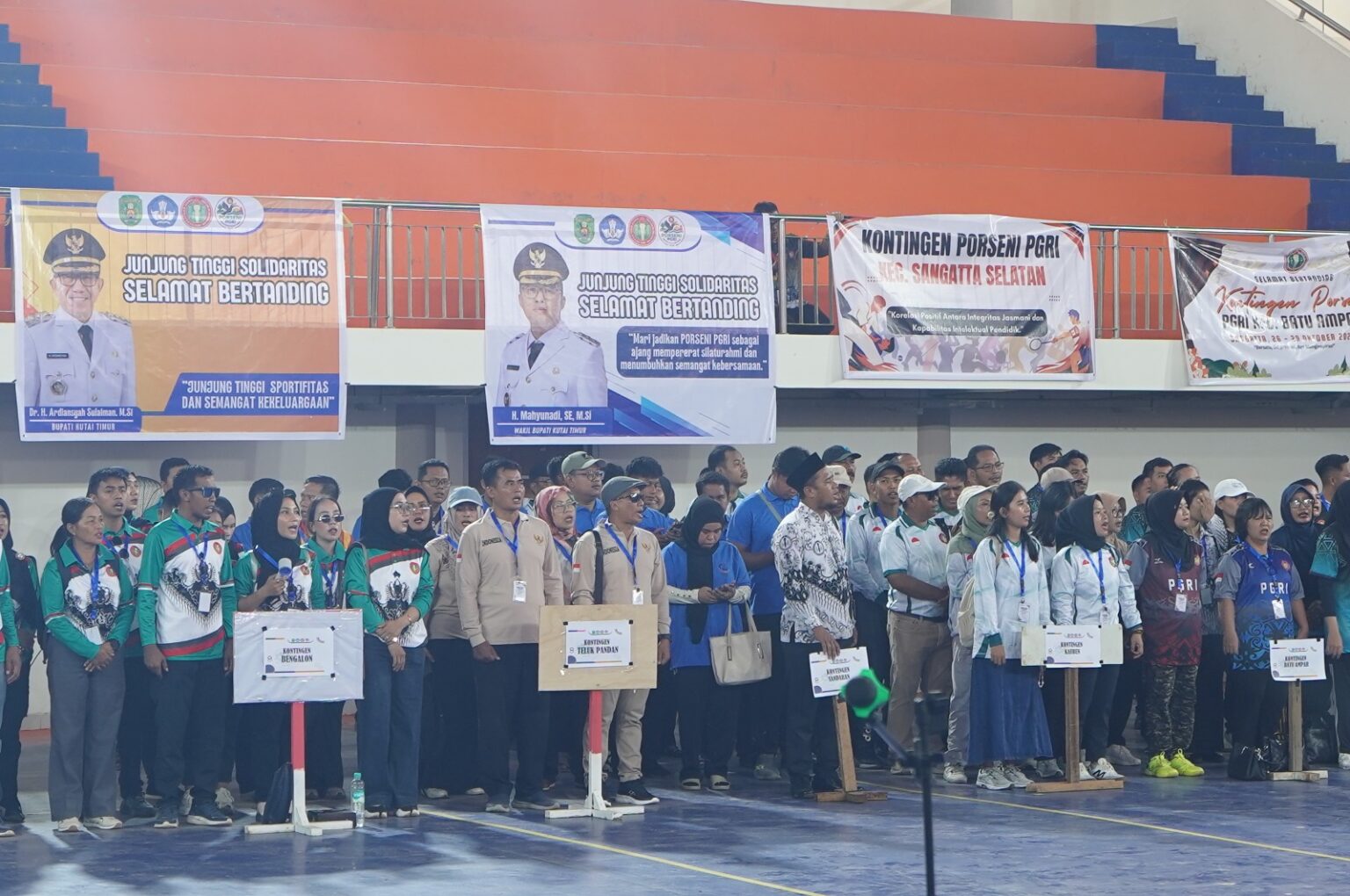 Sangatta News – Suasana persaudaraan kental berpadu dengan semangat kompetisi sehat menyelimuti Gelanggang Olahraga (GOR) Bela Diri Kudungga saat Pekan Olahraga dan Seni (Porseni) PGRI Tingkat Kabupaten Kutai Timur (Kutim) Tahun 2025 resmi dibuka pada Senin (27/10/2025) pagi.