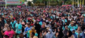 Selepas pembagian kaus, suasana pagi kian semarak dengan senam bersama. Istri Wakil Bupati Kutim Ny Hj Masriati, bersama sejumlah kepala perangkat daerah ikut bergoyang mengikuti irama, dipandu para instruktur di atas panggung. Ribuan peserta mengikuti gerakan senam dengan kompak hingga menjelang pelepasan peserta jalan sehat.
