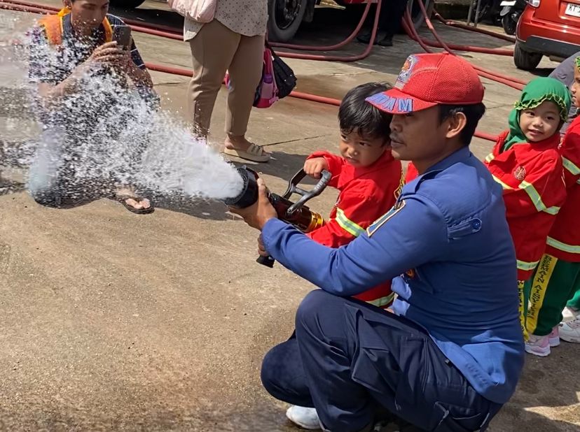 Momen yang paling dinantikan akhirnya tiba. Mengenakan atribut baju pemadam kebakaran yang ikonik, para murid TK ABA berkesempatan memegang selang raksasa dan menyemprotkan air langsung dari mobil pemadam. Sorak sorai dan tawa pecah saat air memancar, memberikan pengalaman tak terlupakan bagi para siswa.