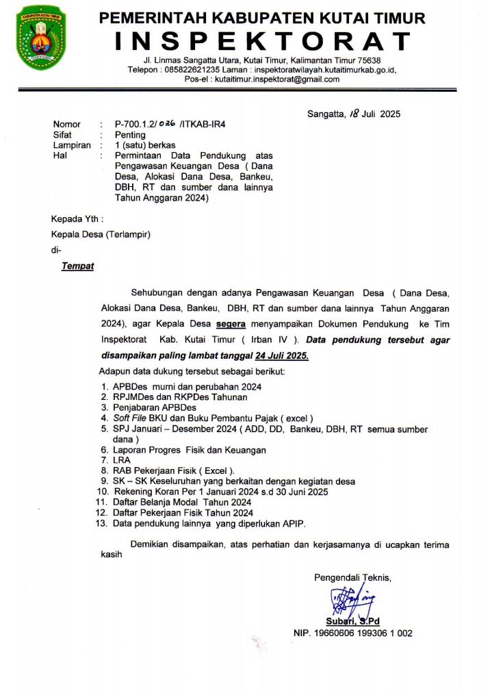 Sangattanews– Dalam rangka pelaksanaan pengawasan terhadap pengelolaan keuangan desa, Inspektorat Wilayah (Itwil) Kabupaten Kutai Timur (Kutim) melalui surat dengan nomor P-700.1.2/026/ITKAB-IR4 secara resmi meminta 17 kepala desa untuk menyerahkan seluruh dokumen dan data pendukung penggunaan anggaran desa tahun anggaran 2024. Kamis, 24 Juli 2025