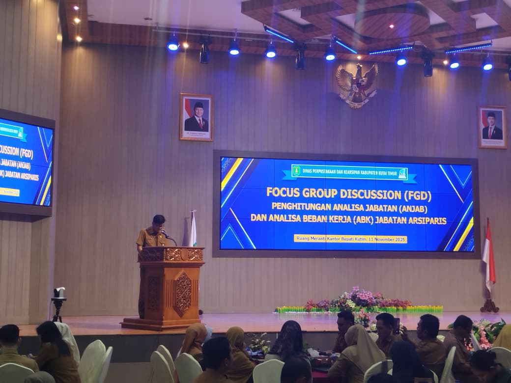 Sangatta News – Arsip memegang peran vital dalam menciptakan tata kelola pemerintahan yang transparan dan berintegritas. Pesan itu disampaikan Asisten Administrasi Umum Setkab Kutai Timur (Kutim), Sudirman Latief, saat membuka Focus Group Discussion (FGD) Penghitungan Analisis Jabatan (Anjab) dan Analisis Beban Kerja (ABK) Jabatan Arsiparis yang digelar Dinas Perpustakaan dan Kearsipan (Dispusip) Kutim, Senin (11/11/2025) di Ruang Meranti Kantor Bupati.