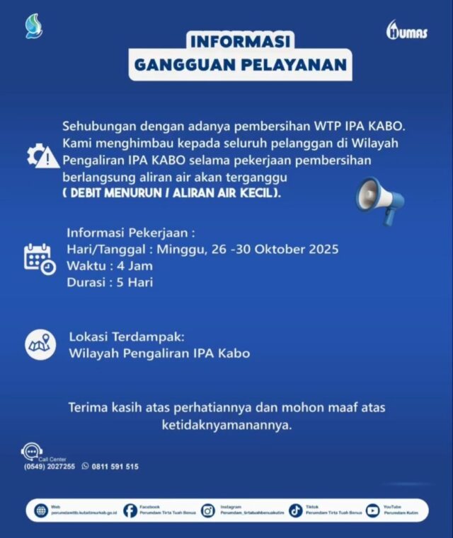 Dalam keterangan resminya, Humas Perumdam TTB Kutim menjelaskan bahwa pembersihan instalasi dilakukan secara berkala untuk menjaga performa sistem pengolahan air agar senantiasa optimal. “Perawatan dan pembersihan IPA ini dilakukan secara berkala untuk memastikan proses pengolahan air berjalan optimal. Kami memohon maaf atas ketidaknyamanan yang mungkin dirasakan pelanggan selama pekerjaan berlangsung,” tulis pihak Humas Perumdam TTB Kutim dalam rilis resminya, Sabtu (25/10/2025).